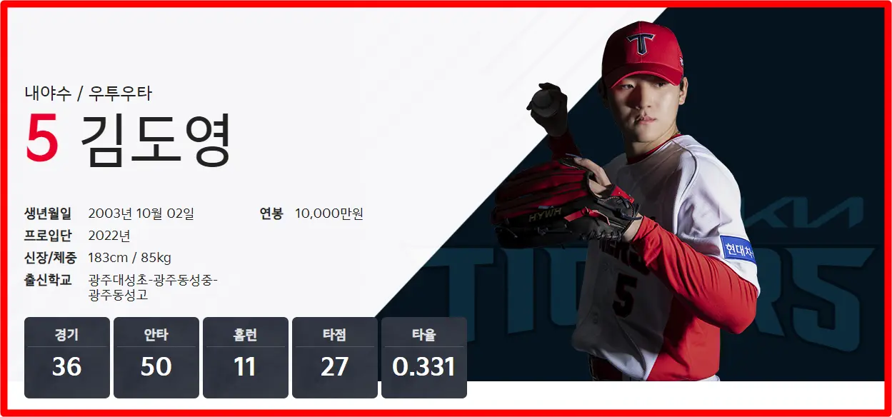 김도영은 시즌 첫 해부터 지금까지 꾸준하게 성적이 올라가며 성장하는 모습을 보여주고 있습니다.
