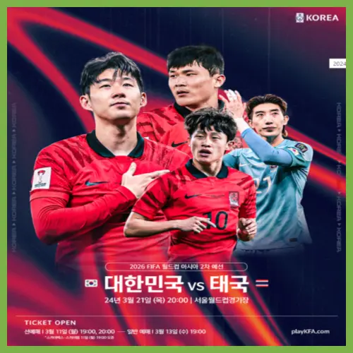 3월 21일 목요일 20시 서울 상암 월드컵 경기장에서 2026 북중미 월드컵 아시아 2차 예선 한국 태국 축구 경기가 진행됩니다. 많은 축구팬들이 직관을 기다리고 계실 텐데요. 티켓 예매 일정 가격 구매 방법까지 자세하게 알아보도록 하겠습니다.