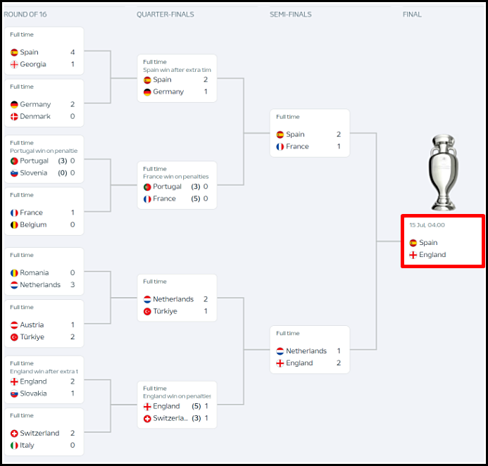 16강 토너먼트부터 진행을 하여 많은 팀들이 탈락을 하고 최종 스페인과 잉글랜드가 결승에서 만났습니다.