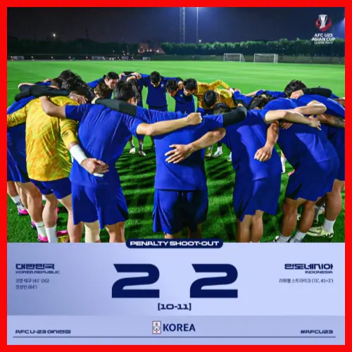 연장전으로 접어 들어서도 승부를 가리지 못한 양 팀은 승부차기 결과 11대 10으로 인도네시아가 승리하며 대한민국의 4강 진출과 함께 올림픽 10회 연속 본선 진출의 기록도 멈추게 되었습니다.