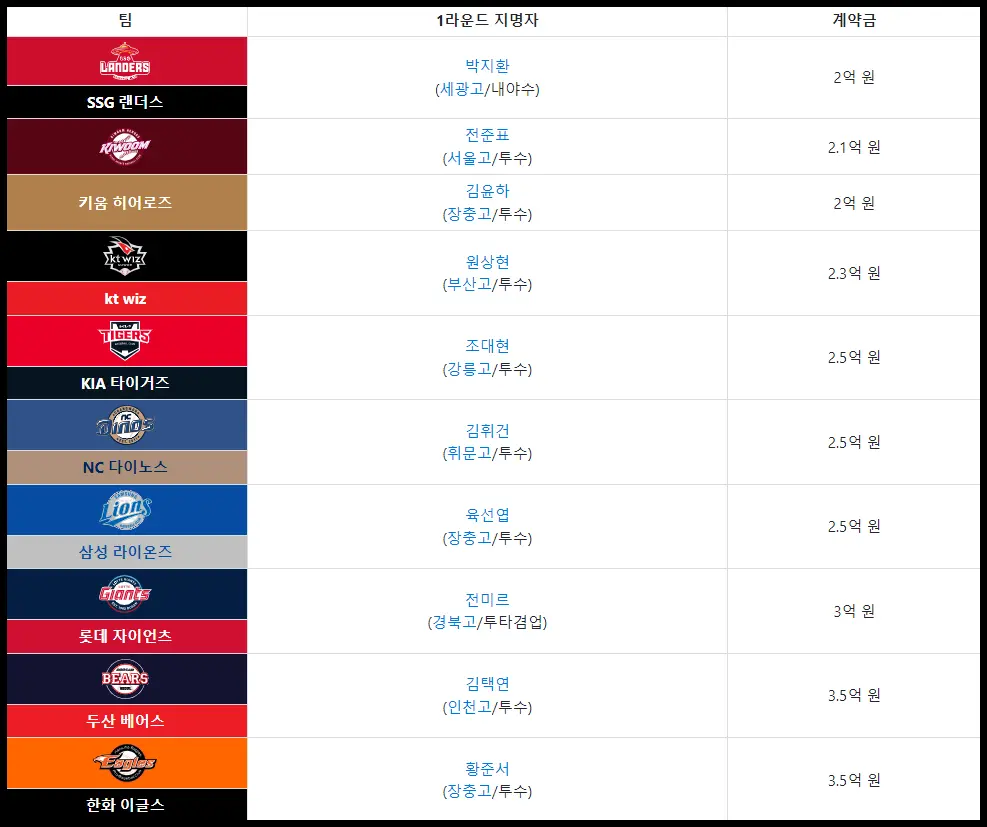신인 드래프트 명단에서 1라운드 계약금으로 가장 적게 받은 선수는 SSG 랜더스의 박지환으로 2억 원이며 가장 높은 1라운드 계약금 선수는 두산 베어스 투수 김택연과 한화 이글스 황준서가 3억 5천으로 나란히 1등을 차지하였습니다.