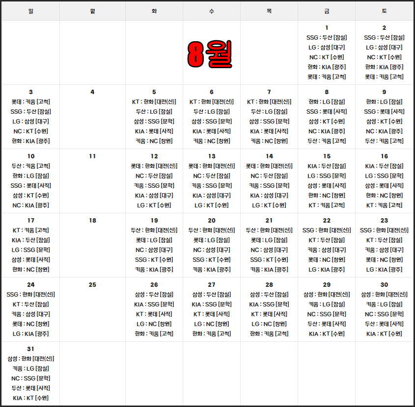 10개 구단 팀당 144경기를 치르는 2025 프로야구 일정은 3월 개막전을 시작으로 8월까지 경기 확정이 되었고 우천이나 부득이한 사유로 취소되는 경기들을 모아 9월이 되기 전 이후 경기가 편성이 됩니다.