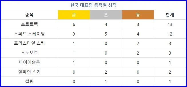 대한민국은 현재 쇼트트랙에서 가장 많은 메달을 획득하였으며 스피드 스케이팅도 좋은 성적을 거두고 있습니다.