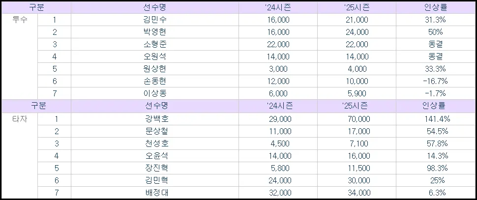 - 문상철: 1억 1,000만 원 → 1억 7,000만 원 (인상률 54.5%)